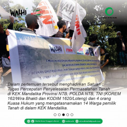 - Menolak pertemuan diselenggarakan oleh MENKOPOLHUKAM RI terkait rapat koordinasi penyelesaian sengketa Tanah KEK Mandalika yang tidak melibatkan semua warga terdampak