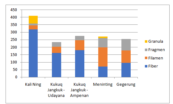 Dari Grafik diatas menunjukan bahwa kandungan mikro plastic tertinggi ada di Kali Ning yang ada di dalam kota Mataram, melalui pemukiman padat penduduk yang tidak memiliki sarana pengelolaan sampah dan perilaku warga membuang sampah kedalam saluran