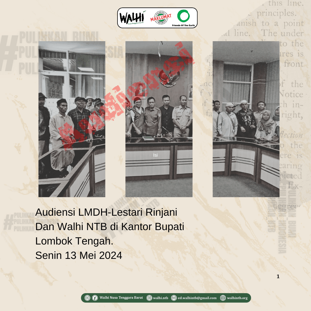 Audiensi ini dihadiri oleh Bupati Lombok Tengah Lalu Pathul Bahri selaku Ketua GTRA kabupaten lombok tengah dan Pak Subhan Kepala Kantor Pertanahan ATR/BPN Lombok Tengah, bersama sekitar 30 perwakilan masyarakat penggarap dan didampingi oleh Walhi NTB. Diskusi yang mengungkap sejumlah permasalahan dan komitmen untuk menyelesaikannya. Notulensi pertemuan mencatat sejumlah poin yang menjadi fokus pembicaraan.