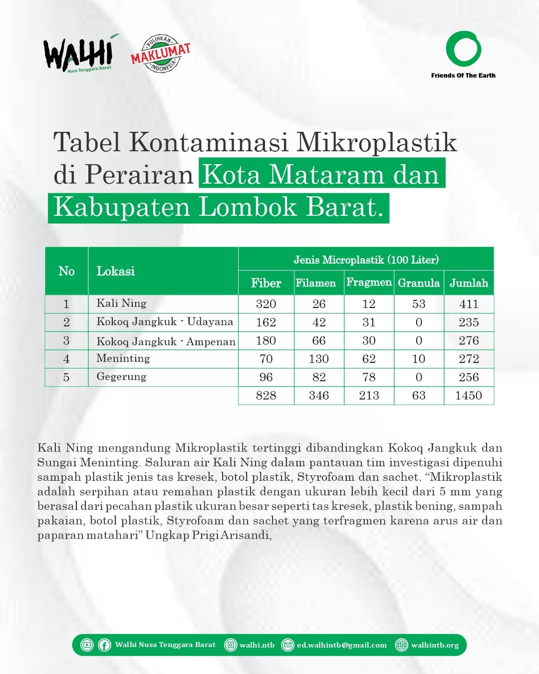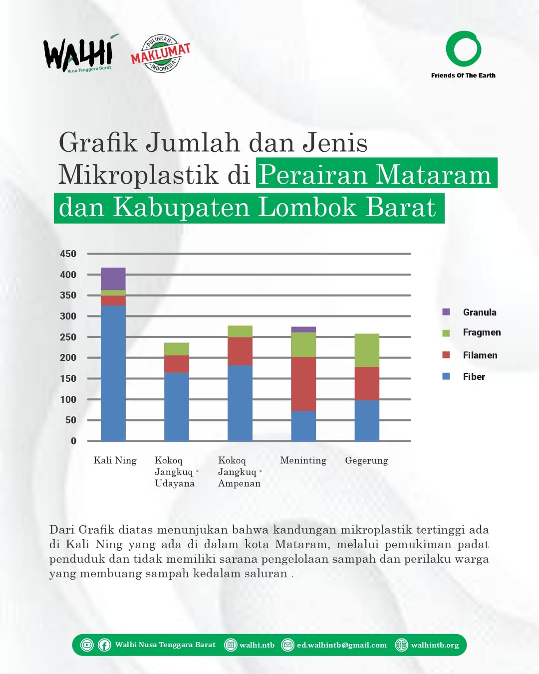 Tim Investigasi NTB Barat dan Tim Ekspedisi Sungai Nusantara Melakukan inventarisasi Timbulan sampah plastik di Saluran dan Sungai di Kota Mataram dan Menemukan perubahan fungsi sungai menjadi Tempat sampah. “Kami menemukan fakta bahwa sungai di kota Mataram berubah menjadi Tempat sampah, sampah sachet, tas kresek, Styrofoam, popok bayi dan sampah pakaian “ . Ungkap Bima Bani Perkasa, Tim investigasi yang beranggotan Peneliti dan Relawan Walhi NTB Bima bani perkasa, Angga putradi, Mathori abdul wahid dan Nelda Hannia serta Peneliti ESN Prigi Arisandi dan Amiruddin Muttaqin mengambil sampel air pada 5 lokasi di Kali Ning, Kokoq Jangkuk dan Sungai Meninting dan rata-rata 290 Partikel Mikroplastik dalam 100 liter air.